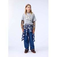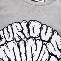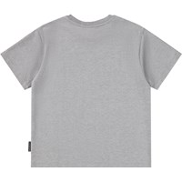Grey melange T-shirt made of soft organic cotton with short sleeves and a ribbed neckline. The T-shirt has a loose fit with a white text on the front saying "Curious minds?".