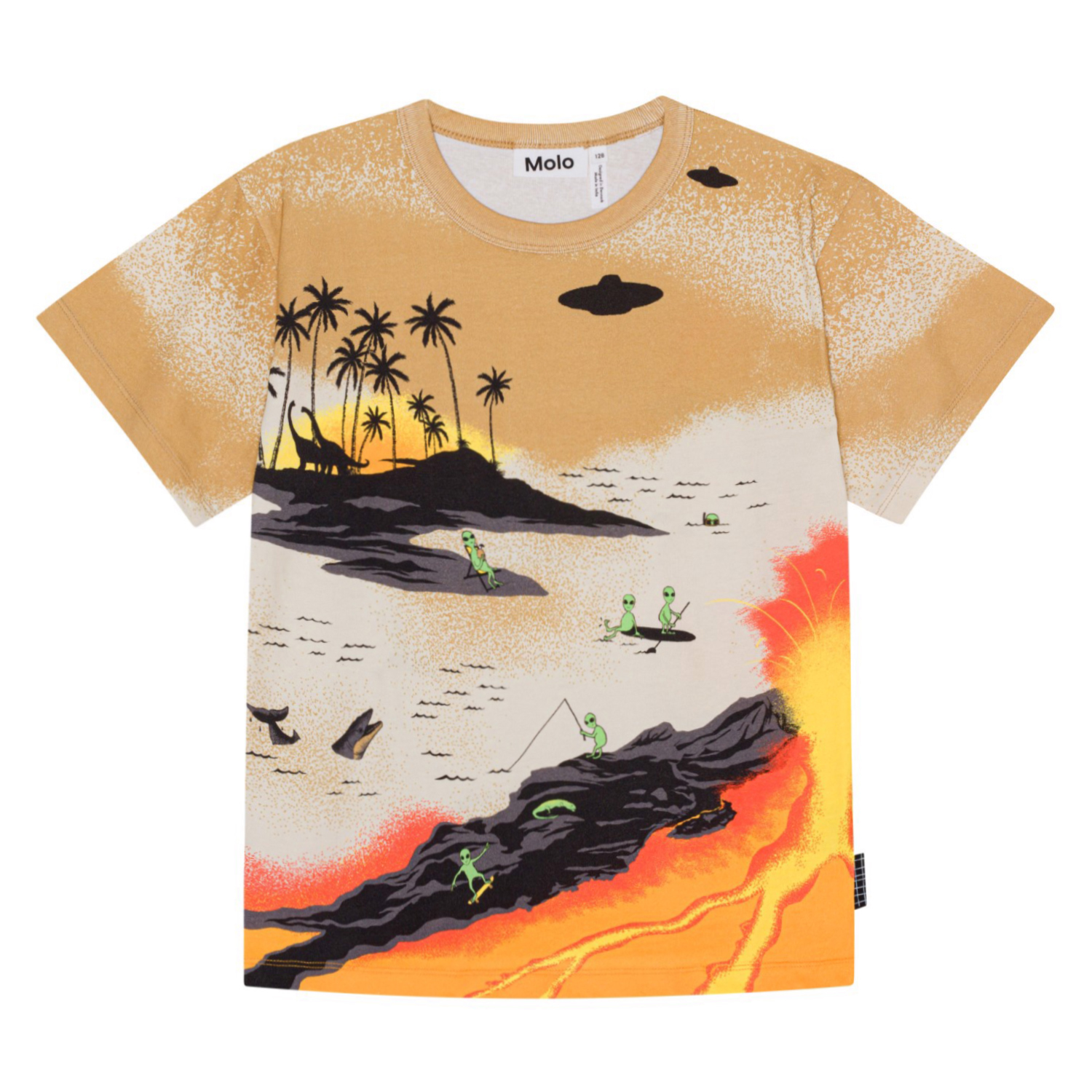 Riley is a t-shirt in 100% organic cotton with a allover print of an alien that has brought some friends along. They are having a great time, doing different activities in a landscape of palm tree islands and fire-breathing volcanos. The small aliens are bright green against a yellow, orange and sand coloured background. This t-shirt has a round neck with a rib edge, a print on the front and is in a loose fit.