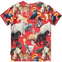 Multicoloured T-shirt in organic cotton with short sleeves and a round neckline with ribbed trim. The T-shirt has a loose fit and an all-over print of various animals on a red background.