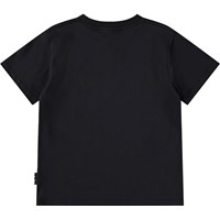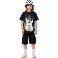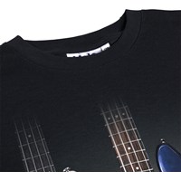 Black T-shirt made of soft organic cotton with short sleeves and a ribbed neckline. The T-shirt has a loose fit with a print of colourful rock guitars.