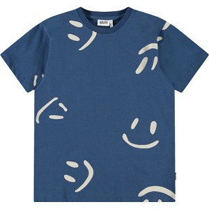 Blue t-shirt in soft organic cotton with short sleeves and ribbed neckline. The t-shirt has a loose fit and an all-over print of off-white smiling faces.