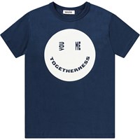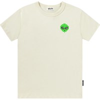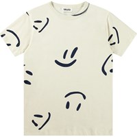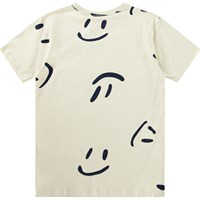 Off-white T-shirt in organic cotton with short sleeves, round neckline, and ribbed trim at the neck. The T-shirt has a loose fit and an all-over print of lots of smiling faces in black.