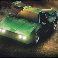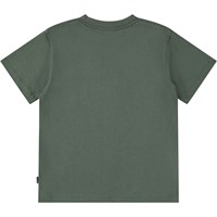 Dark green T-shirt made of soft organic cotton with short sleeves and a ribbed neckline. The T-shirt has a loose fit with a front print of a sports car in the forest mist.