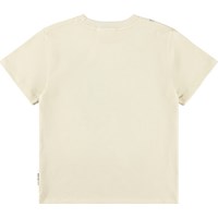 Beige T-shirt made of soft organic cotton with short sleeves and ribbed neckline. The T-shirt has a loose fit with a print of colourful rock guitars.