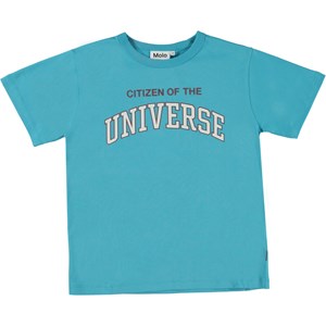 Blue t-shirt with a retro graphic print on the front. The print says, 'Citizen of the Universe' and helps convey the message that we are all part of the same universe. This t-shirt is constructed in 100% cotton, has short sleeves, a round neck with rib and is in a loose fit.