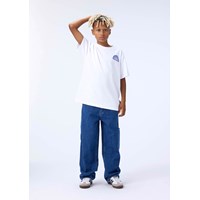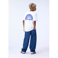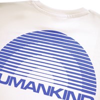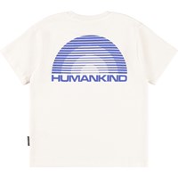 White T-shirt made of soft organic cotton with short sleeves and a ribbed neckline. The T-shirt has a loose fit and a print of a blue rainbow with the text ''Humankind''.