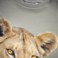 Khaki-coloured t-shirt made of soft organic cotton with short sleeves and a ribbed neckline. The T-shirt has a loose fit with a print of a close-up of a lion in golden colours.