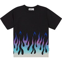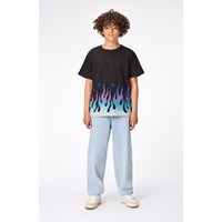 Black t-shirt in 100% organic cotton with a placement print on the front and back. The print is a graphic flame motif in sprayed, gradient colours of dark blue, purple, turquoise and grey. The flames are licking the bottom of the t-shirt. This shirt is "On fire!". Riley has a round neck with a rib edge and is in a loose fit.