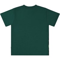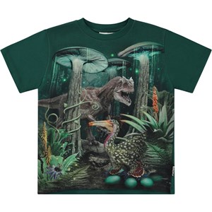 Dark green t-shirt with a front print of fantastical creatures from the distant future that are wandering around in a magical forest. Gigantic, bioluminescent mushroom trees and fireflies illuminate the scene. A colourful, bird-like dinosaur is keeping a watchful eye on her emerald coloured eggs on the floor of the forest, while other dinosaurs are lurking around in the background, searching for food. This t-shirt is constructed in 100% cotton, has short sleeves, a round neck with rib and is in a loose fit.