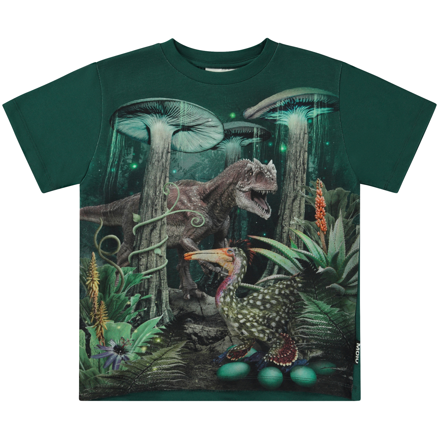 Dark green t-shirt with a front print of fantastical creatures from the distant future that are wandering around in a magical forest. Gigantic, bioluminescent mushroom trees and fireflies illuminate the scene. A colourful, bird-like dinosaur is keeping a watchful eye on her emerald coloured eggs on the floor of the forest, while other dinosaurs are lurking around in the background, searching for food. This t-shirt is constructed in 100% cotton, has short sleeves, a round neck with rib and is in a loose fit.