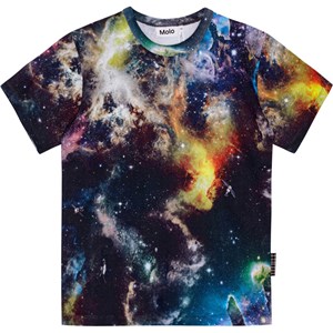 Multicoloured T-shirt in organic cotton with short sleeves, round neckline, and ribbed trim at the neck. The T-shirt has a loose fit and an all-over print inspired by an image from the James Webb Space Telescope, depicting outer space. If you look closely, you might spot some free-floating satellites.