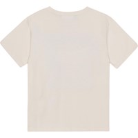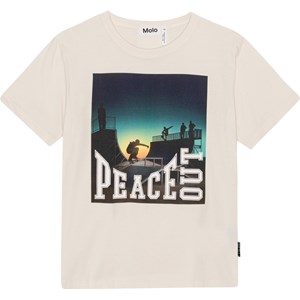Riley is a beige t-shirt in 100% organic cotton with a front placement print. The print is of vert (vertical) skaters enjoying an evening session, and underneath the picture is "Peace Out" written in a varsity text. Riley has a round neck with a rib edge, a print on the front and is in a loose fit.