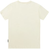 Off-white T-shirt in organic cotton with short sleeves, round neckline, and ribbed trim at the neck. The T-shirt has a loose fit and features a printed design on the front of a small, green-pixel alien.