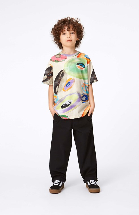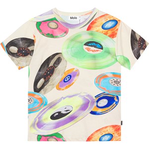 Riley is a beige t-shirt with a multi-coloured, all over print in 100% organic cotton. The print is of beautiful, colourful vinyl records, flying around on a black background. Riley has a round neck with a rib edge and is in a loose fit.