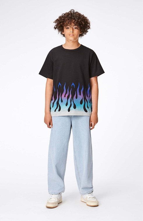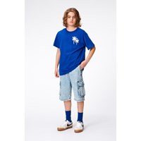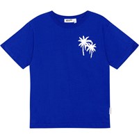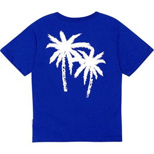 Riley is a blue t-shirt in 100% organic cotton. There is a small, white palm tree print on the front that gets repeated in a larger size on the back. If you look closely, you'll probably see a hidden, 'More Love' message. Riley has a round neck with a rib edge and is in a loose fit.