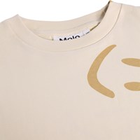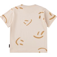 Beige T-shirt made of soft organic cotton with short sleeves and ribbed neckline. The T-shirt has a loose fit with a print of smiling faces.