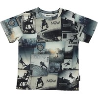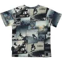 Riley is a t-shirt with a print of skaters on ramps around the world.