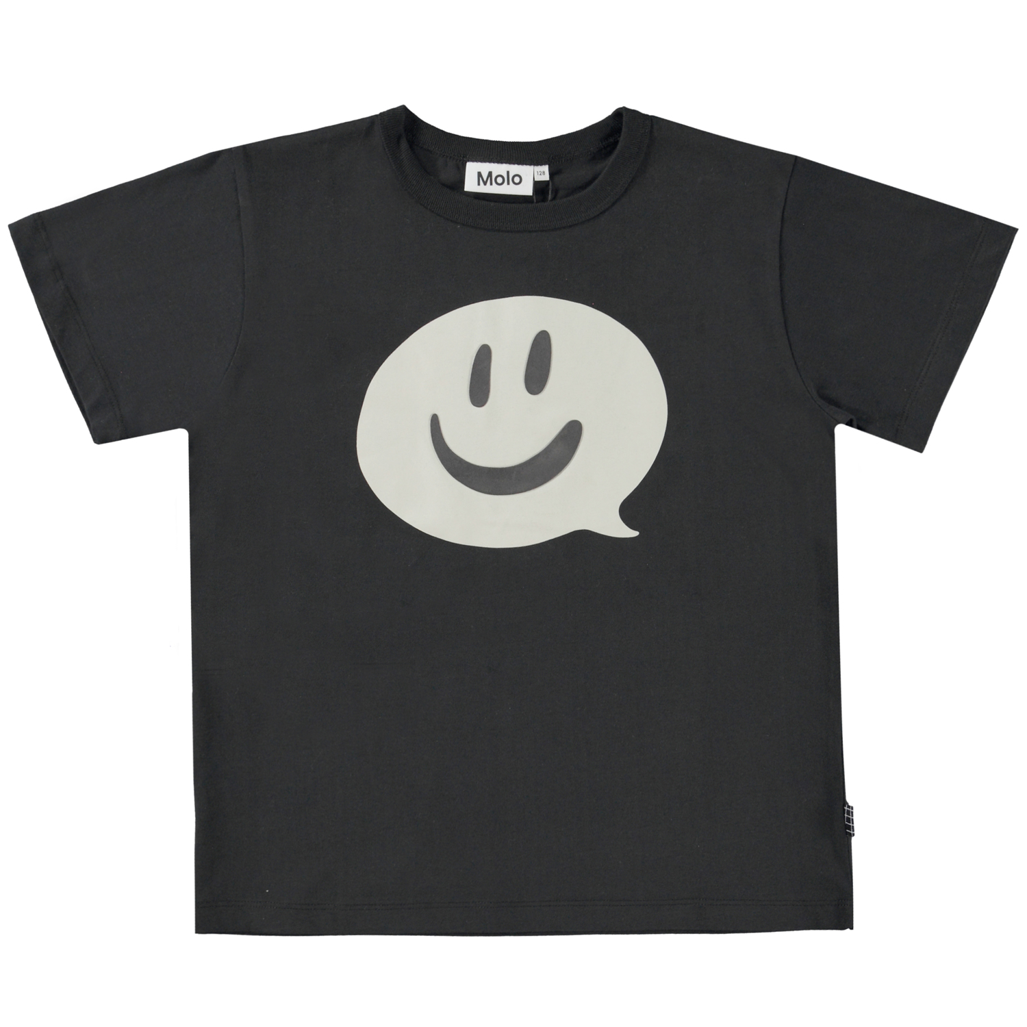 Black t-shirt with a front print of a happy, smiley face speech bubble. This t-shirt is constructed in 100% cotton, has short sleeves, a round neck with rib and is in a loose fit.