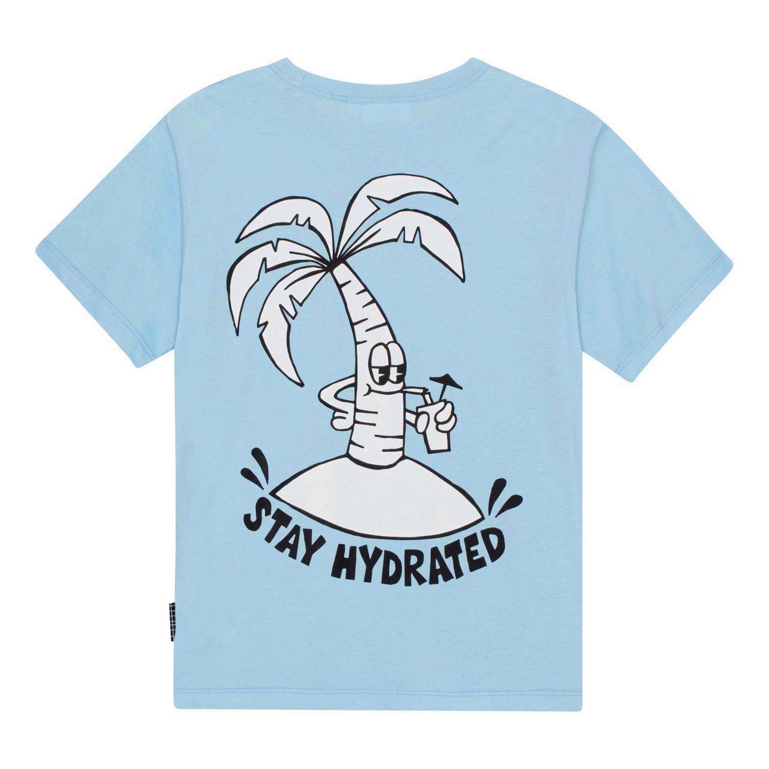 Riley is a light blue t-shirt in 100% organic cotton with a front and back placement print. The print is a cartoon style palm tree that's on its own little island, enjoying a cool drink. It has the message "Stay Hydrated" and how important it is for people and nature to get lots of water. Riley has a round neck with a rib edge and a loose fit.