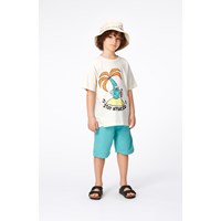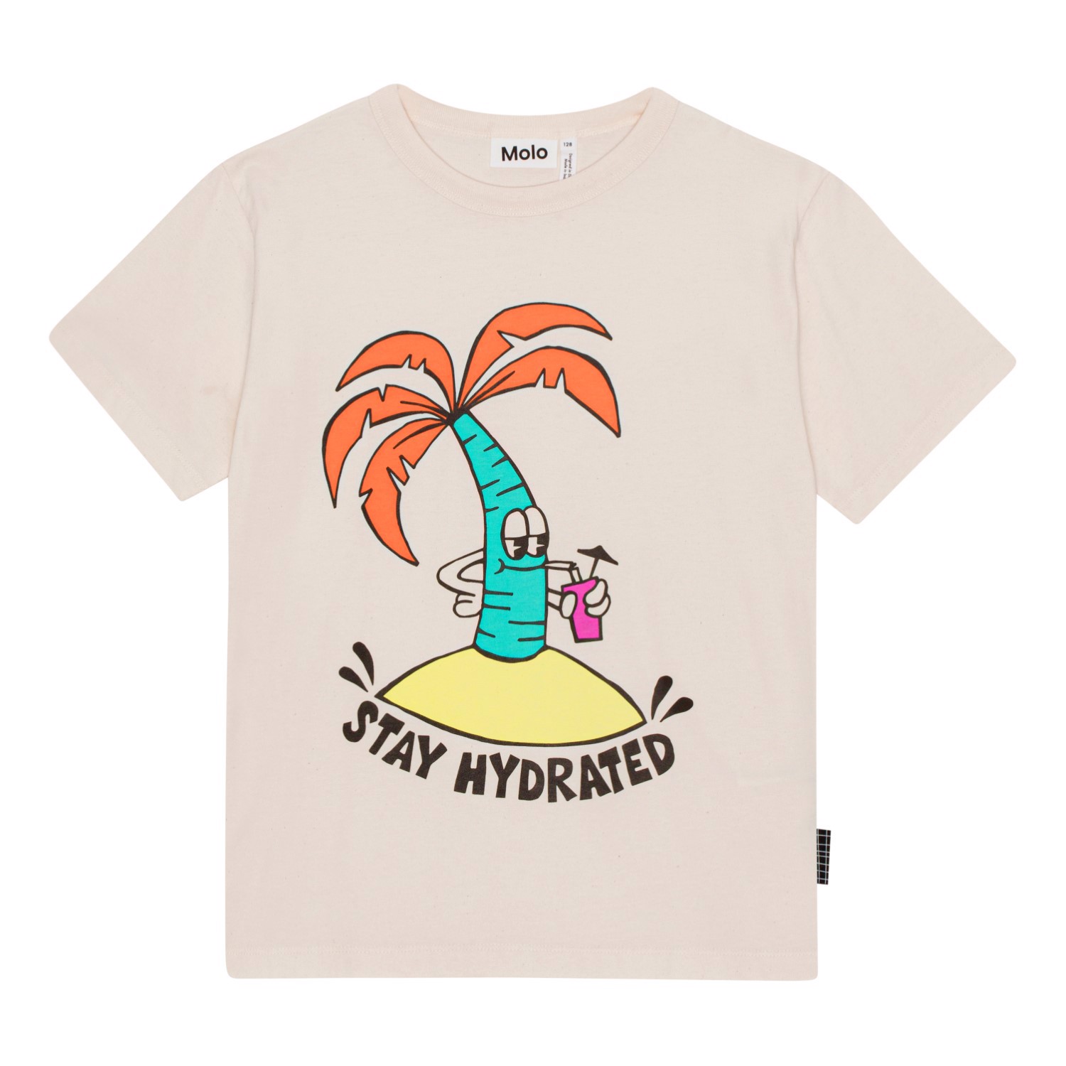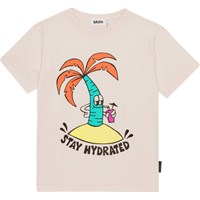 Riley is a light, natural coloured t-shirt in 100% organic cotton with a front placement print. The print is a cartoon style palm tree that's on its own little island, enjoying a cool drink. It has the message "Stay Hydrated" written on it because it's important for people and nature to get lots of water. Riley has a round neck with a rib edge and a print on the front. The t-shirt is in a loose fit.