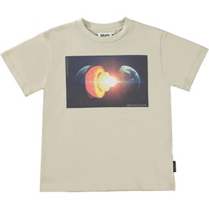 Riley is a beige t-shirt with a print of the Earth in layers, from the outer layer to the inner core.