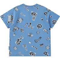 Blue T-shirt made of soft organic cotton with short sleeves and ribbed neckline. The T-shirt has a loose fit with a print of black and white prints.