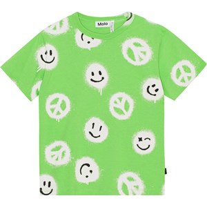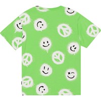 Green t-shirt with a white and black all over print in 100% organic cotton. The all over print is of a lot of spray painted peace signs and smiling faces that help spread the message of 'More Love'. Riley has a round neck with a rib edge and is in a loose fit.