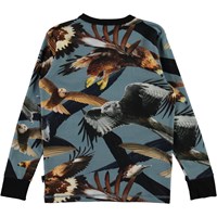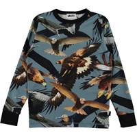 Rill is a long sleeve blue t-shirt with an all-over print of large birds. Search the print and see if you can spot the different bird species. Rill has a black edge tape at the neck and sleeves.