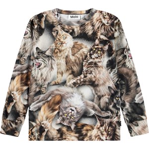 Long-sleeved top made of soft organic cotton with a ribbed neckline and sleeves. The long-sleeved top has a regular fit with a print of cats in golden brown colors.