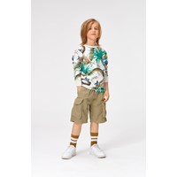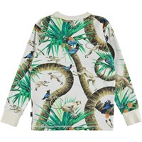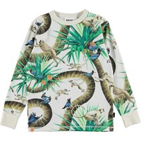 The blue birds are sitting in the curved jungle trees while naughty monkeys are jumping around and creating havoc. The "Monkey Business" print is on Rill, which is a long sleeve t-shirt with white rib at the neck and sleeves.