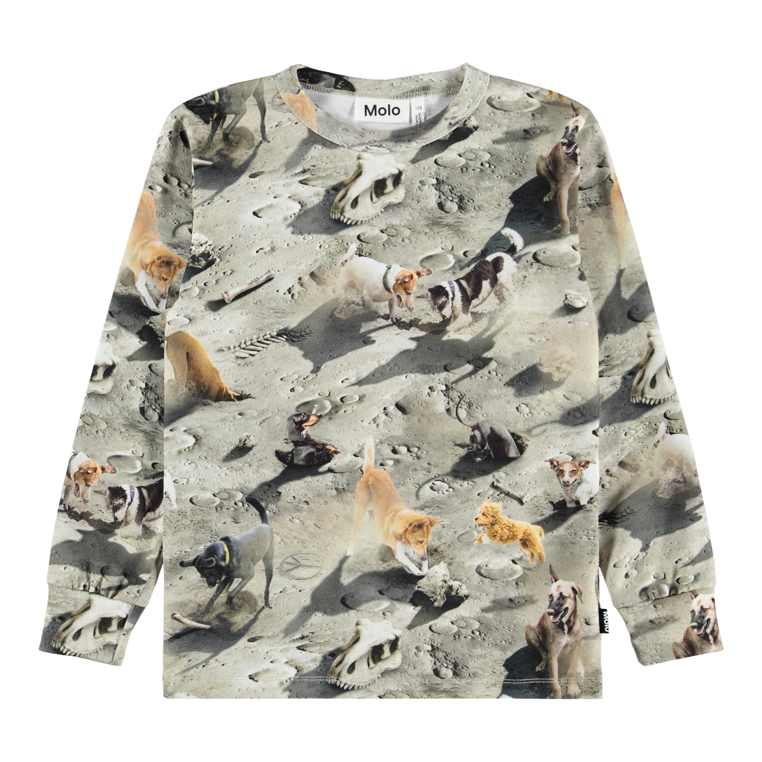 Grey long-sleeved top made of soft organic cotton with a ribbed neckline and sleeves. The long-sleeved top has a regular fit with a print of dogs on the moon.