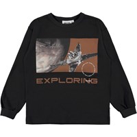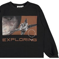 Rin is a long sleeve black top with a print of a satellite flying around Mars and has the text 'Exploring'.