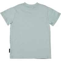 Road is a light blue t-shirt with a print of dinosaurs that are both over and under the water's surface.