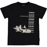 Road is a black t-shirt with a fast car on the front with the text 'Past, present, future'.