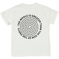 Road is a white t-shirt with a printed spiral text on the front and back. The wonderful message in the spiral is: "The whole is greater than the sum of the parts".