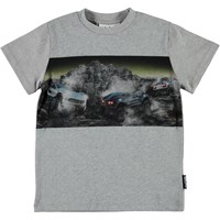 Road is a grey t-shirt with a print of off-road cars on the front.