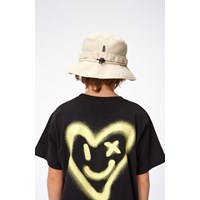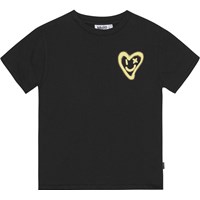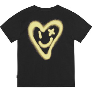Rodney is a black t-shirt in 100% organic cotton with a yellow, front and back placement print. On the front, there is a small, yellow, spray paint looking heart that is smiling and winking at you. The print on the back is a larger version of the same heart. Rodney has a round neck with rib and is in an oversized fit. If you want a more classic fit, or if your child is between sizes, we recommend you choose one size smaller than normal.