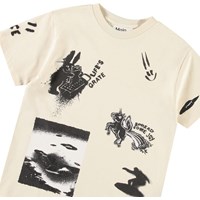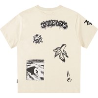 Off-white t-shirt in organic cotton with short sleeves and ribbed neckline. The t-shirt has a loose fit with a black all-over print of the collection's themes about enjoying life.