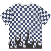 White and blue checkered t-shirt in organic cotton with short sleeves and ribbed neckline. The t-shirt has a loose fit and a print referencing the motocross world with black flames at the bottom.