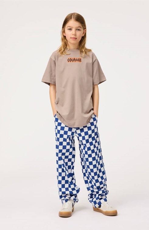 Light brown t-shirt in organic cotton with short sleeves and ribbed neckline. The t-shirt has a loose fit with the fiery and colourful text 'Courage' written on the front and back.