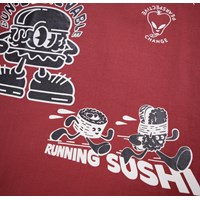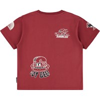 Bordeaux T-shirt made of soft organic cotton with short sleeves and a ribbed neckline. The T-shirt has an oversized fit with a print of various running groceries.