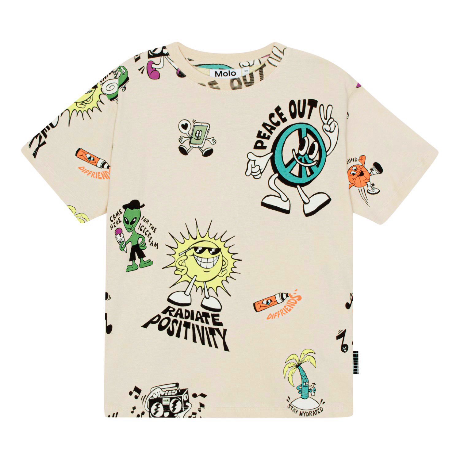 Off-white t-shirt in 100% organic cotton in a colourful, all over print of fun comic figures. There's a fun sun, an alien eating ice cream, a dancing boombox and much more. All of it is giving off a positive summer vibe. The t-shirt has a round neck with a rib edge and is in a loose fit.