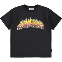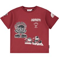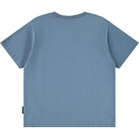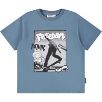 Blue T-shirt made of soft organic cotton with short sleeves and a ribbed neckline. The T-shirt has an oversized fit with a black and white front print of a skateboarder and phrases like ''Freedom'' and ''Future''. If you prefer a more regular fit, we recommend to choose a size smaller, this also applies if your child is between two sizes.