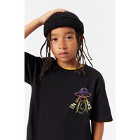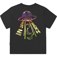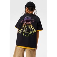 Black T-shirt made from organic cotton with short sleeves, a round neckline, and a ribbed trim at the neck. The T-shirt has an oversized fit and a printed design on both the front and back. The print is a multicoloured drawing of a UFO searching for snacks, and it appears on a small scale on the front and a large scale on the back.
