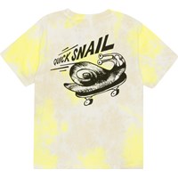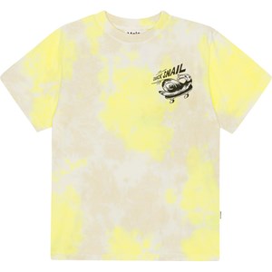 Rodney is a t-shirt with a tie-dye print in 100% organic cotton and with a small placement print on the front and a large print on the back. The print is of a cool snail that redifines the term "snail's pace" as it zooms along on its skateboard. The print is a cartoon style illustration in black and white on a citrus yellow and sand coloured, tie-dye t-shirt. Rodney has a round neck with a rib edge and is in an oversized fit. If you want a more classic fit or if your child is between sizes, we recommend choosing one size smaller than normal. Molo's tie-dye prints are unique and made by hand, so the print can vary from style to style.