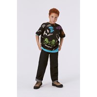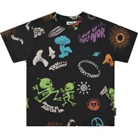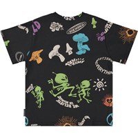Black t-shirt in a multi-coloured placement print. The print shows elements from different prints in various collections. Say hi to dancing aliens, a shining sun, all the planets, a smile, beating hearts, a peace sign and happy mushrooms. What a party! This t-shirt is constructed in 100% cotton, has short sleeves, a round neck with rib and is in an oversized fit.