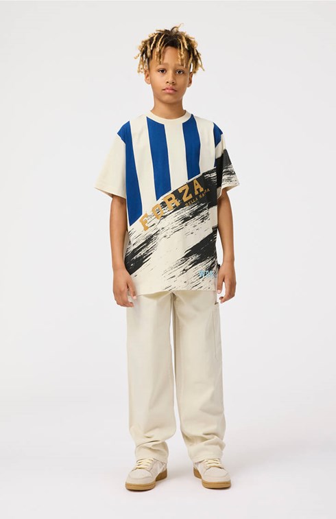 Off-white t-shirt in organic cotton with short sleeves and ribbed neckline. The t-shirt has a loose fit and a cool print inspired by the world of football.