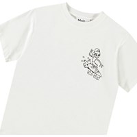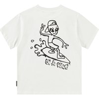 White t-shirt in organic cotton with short sleeves and ribbed neckline. The t-shirt has a loose fit and features a print of an alien on a surfboard and the text "On a wave" on the front and back.