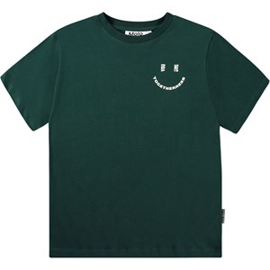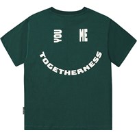 Green T-shirt in organic cotton with short sleeves, round neckline, and ribbed trim. The T-shirt has an oversized fit and a placed text print on the front and back. The print consists of the text "You Me Togetherness" in white and forms a smiling face. A small version is shown on the front, while a large version is shown on the back.
