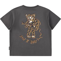 Grey T-shirt made of organic cotton with short sleeves and ribbed neckline. The T-shirt has a loose fit with a print of a tiger on an electric guitar.
